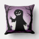 Ilustração de um fantasma assustador em um cemitério com morcegos voando contra uma lua de Halloween luminosa.
