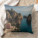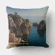 O coxim do travesseiro decorativo da foto com o I famoso Faraglioni balança no mar Mediterrâneo e na construção vermelha da almodrava na cidade de Scopello, perto da reserva natural do Zingaro de Lo na costa norte da ilha de Sicília, Italia.
