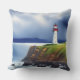 O travesseiro decorativo de Cozy ao ar livre apresenta um farol vermelho e branco sobre penhascos cobertos de grama que olham para o oceano e céus turvos no horizonte - uma aquarela digital gerada por IA.