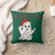 "Fazer Espíritos Brilhantes" travesseiro verde e vermelho de férias com fantasmas vestindo um chapéu de Papai Noel e segurando luzes de Natal