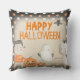 Este travesseiro decorativo de Halloween divertido e festivo apresenta um tema de aquarela fofo e assustador. Várias imagens do Halloween são fotografadas ao redor da fronteira. Uma múmia bonitinha com uma aranha na cabeça é fotografada na parte inferior direita e um pequeno personagem Frankenstein é fotografado à esquerda, de pé com um casal de abóboras. Um fantasma giro está flutuando acima das abóboras. A borda apresenta um fundo preto com bolinhas brancas e laranja. A frase "Feliz Dia das Bruxas" é impressa no centro em uma fonte laranja assustadora.