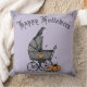 Desenhado à mão a tinta preta, este travesseiro decorativo festivo gótico "Feliz Dia das Bruxas" apresenta ilustrações desenhadas à mão a tinta preta por Nathalie Portet de uma antiga carruagem vitoriana, corvo preto, abóboras e teias de aranha, tudo contra um fundo roxo elegante. Com texto editável, personalize seu travesseiro na página do produto clicando em "Personalizar este modelo" antes de adicionar ao carrinho.