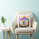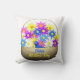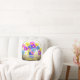 Travesseiro decorativo com meu design original de um bonito cesto de flores e um pequeno pássaro azul para Dia de as mães. O texto personalizável diz "Dia de as mães feliz".