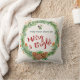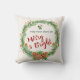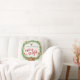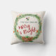 Um travesseiro de Natal com uma coroa de água. Agulhas de pinheiros verdes, cones de pinho e bagas decorativas constituem esta coroa festiva. Dentro a coroa são alguns ornamentos decorativos e as palavras" podem ser Feliz e Brilho. Escrito em uma fonte vermelha da moda.