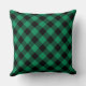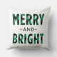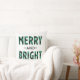 O travesseiro decorativo natalício sazonal apresenta a design de tipografia moderna "Feliz e Brilho", com padrão em um teste / xadrez de búfalos verde e preto rústico. Um padrão coordenado de verificação de búfalos se veste na parte de trás do design travesseiro.