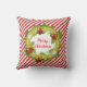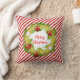 O travesseiro quadrado de poliéster apresenta o texto Feliz de Natal na coroa de feriados em um padrão listrado vermelho e branco.