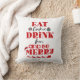 Engraçado travesseiro decorativo decorativo de Natal para amantes de vinho em uma design de tipografia vermelha que diz: Coma biscoitos, beba vinho e seja feliz. Junto com o texto ele apresenta elementos bonitos de Natal, como Papais noeis e seu trenó, chapéu de Papai Noel e ornamentos decorativos de árvores. Travesseiro se reverte para uma xadrez preta e vermelha, dando a você dois diferentes invernos e olhares de férias com um travesseiro decorativo.