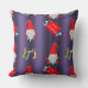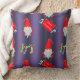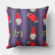 Uma almofada de Natal muito bonita para decorar sua casa durante as próximas férias. Este lindo padrão de gnomos e elfos de Natal tem meias de Natal e a saudação, "Feliz Natal", com caramelos vermelhos, todos com um fundo roxo.