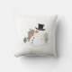 Ilustração de um boneco de desenho animado de Natal em uma cena de neve com casas cobertas de neve e uma árvore ao fundo.
