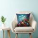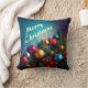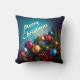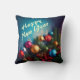 Feliz Natal e Feliz ano novo, dois Travesseiros decorativos personalizados de personalização parcial de texto. Decoração colorida sobre fundo azul profundo. Personalize este travesseiro com seu próprio texto.