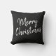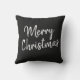Este travesseiro decorativo festivo apresenta a frase Feliz Natal em uma tenda escrita com letras cursivas em preto e branco.