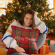 Bonito travesseiro decorativo vermelho com Feliz Natal. A xadrez vermelha é um lindo e tradicional padrão de Natal.