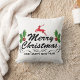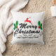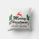 Um travesseiro decorativo branco com um design festivo. A design inclui as palavras "Feliz Natal" numa letra decorativa de escrita negra, com florescimento estendido das extremidades das palavras. Acima do "Feliz Natal" está uma silhueta vermelha de uma rena saltando, e em ambos os lados estão prigos de sagrada com folhas verdes e bagas vermelhas. Abaixo do texto principal, "AND FELIZ ANO NOVO!" é impresso com uma letra preta simples e em negrito. O estilo geral é limpo e gráfico, adequado para decoração de feriados.