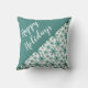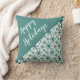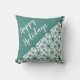 Moderno Script Snowflakes Travesseiro decorativo de Natal. Na moda de Natal travesseiro decorativo com um roteiro de tendências brancas para feriados felizes. Metade do travesseiro é azul e a outra metade tem um lindo padrão de flocos de neve. travesseiro de Natal de excelente para um sentimento festivo de Natal ou um presente para uma família e amigos. Você pode personalizar o texto ou apagá-lo.