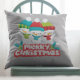 Um trio de bonitos bonitos bonitos bonitinhos com chapéus festivos de inverno e cachecóis, texto "Feliz Natal" sobre o fundo das cinzas.