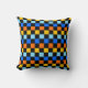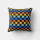 A vibrant checkerboard pattern featuring alternating rows of orange, yellow, light blue, and blue squares against a black background. The design is bold and energetic.