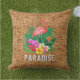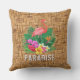 Um flamingo cor-de-rosa, flores tropicais e folhas sobre o padrão de impressão de wicker tecidas faz travesseiros de verão na moda ao ar livre. CORRESPONDENDO a itens na nossa loja.