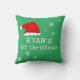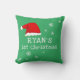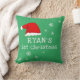 O Primeiro Natal do Pai Natal Verde Flocos de Neve Flocos de Neve travesseiro. Primeiro design de Natal bonito com um chapéu de Papai Noel, flocos de neve e um nome de bebê em um roteiro branco - personalize com o nome do seu bebê.