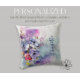 Um bonito travesseiro decorativo personalizado com a imagem de aquarelas florais em tons de roxo, lavanda e rosa com seu nome em uma bela fonte de script.