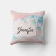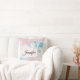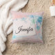 Um travesseiro com lindas flores azuis sobre fundo rosa. Uma imagem de uma página de notebook em forma de retângulo colocada sobre cima para que você escreva seu dentro de texto.