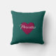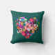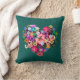 Um bonito padrão floral vermelho de coração, travesseiro decorativo com flores coloridas brilhantes em um fundo verde teal. Ao contrário, há o mesmo coração vermelho de amor com espaço para ser personalizado com um nome ou outro texto. Uma decoração caseira colorida ou ideia romântica de presente.