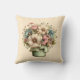 Travesseiro com uma imagem fofa. Azul. flores cor-de-rosa e creme com folhas verdes. Colocado dentro de um vaso de flores verde com um pano xadrez verde pendurado na lateral.