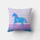 Um travesseiro com um bonito cavalo aquarela em cores azul e roxo. Correndo selvagem e livre. Colocado sobre um fundo listrado roxo com um talo de vintage. Uma borda de aquarela azul e cor-de-rosa colocada na parte inferior.
