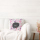 Um travesseiro com um padrão floral fofo. Composto de flores rosadas e roxas irregulares, em estilo de entalhe retrô-60. Os corações azuis desbotados, penteiam o fundo num pano de fundo azul pálido. Um círculo desenhado à mão preta é colocado sobre o topo, personalize com seu nome ou outro texto.