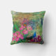 Esta bela design mostra um pavão maravilhoso e penas cercadas por flores roxas e rosa vibrantes, todas sobre músicas em folha, sobre um fundo verde, na sua maioria claro.