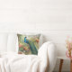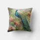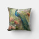 Travesseiro decorativo de decorador com a pintura antiga de um pavão elegante azul e verde em uma floresta exuberante de floral e verde cor-de-rosa pincelado.