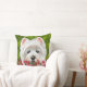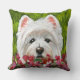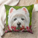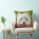 West Highland White Terrier e flores rosa. Cachorro ocidental a espreitar por um arbusto florescente. Sophie. Copyright © 2025 Angi Laframboise. Dons de cães de arte para amantes de cães.