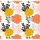 Padrão sem costura com flores, folhas pretas e galhos sobre fundo branco. As flores são laranja, amarela e branca. As folhas são pretas e os ramos são cinzas. O padrão se repete e as flores se arranjam em ordem aleatória.