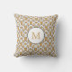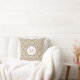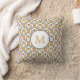 Travesseiro quadrado de flores de deco de arte branca e ouro monograma. O design apresenta um motivo de sol de arte deco em ouro, preto e branco e um círculo branco com o seu primo personalizado.