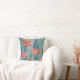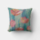 travesseiro decorativo bonito com flores brilhantes de vermelho, rosa e laranja sobre fundo azul-aquoso. Flores originais no trabalho de arte da chuva feitas com uma mistura de colagem, aquarela e pastel.