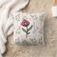 Um travesseiro com seu nome personalizado e dentro de flor rosa bonito com uma borda rosa. O fundo é um padrão com flores silvestres cor-de-rosa desenhadas à mão, com caules longos e folhas verdes sobre um fundo branco de casca-de-ovo. Círculos cor-de-rosa e galhos também decoram o design. Design floral branco e bonito.