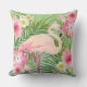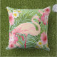 Design de travesseiro de estilo tropical apresenta um flamingo cor-de-rosa enquadrado com um padrão no estilo da ilha havaiana de flores vibrantes, cor-de-rosa, amarelas e brancas hibiscus e um fundo verde de folha de palma.