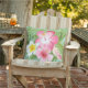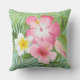 O design de travesseiro de estilo tropical apresenta um padrão verde de folha de palma de frondes em camadas com fundo verde/azul de mar aqua com lindas flores de hibisco rosa.