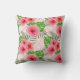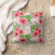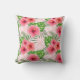 O travesseiro decorativo colorido apresenta flores de hibisco, samambaias e folhas tropicais cor-de-rosa tropical sobre rosas claro e fundo geométrico branco.