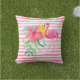 Um flamingo cor-de-rosa brilhante e um arranjo floral de hibisco tropical são colocados contra um fundo divertido de listras cor-de-água rosa e brancas. A parte de trás do travesseiro decorativo apresenta as listras coloridas rosa, sem os elementos tropicais. Se você preferir usar seu travesseiro em ambientes fechados, poderá escolher tecido de poliéster ou algodão em vez de tecido ao sair. Uma bolsa de bolsa de praia correspondente também está disponível.