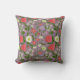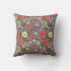 É um travesseiro decorativo com uma ilustração de uma variedade de flores pequenas. Há rosas, margaridas, lírios e tulipas em diferentes cores, como violeta, branco e rosa.