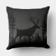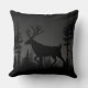 Uma almofada decorativa com uma silhueta preta de um cervo de grandes galhadas numa tranquila floresta de pinheiros, com vários fundos coloridos. Veja todos na Coleção.