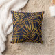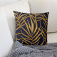 Este travesseiro decorativo apresenta um padrão de folhas tropicais douradas sobre um fundo azul marinho escuro. Ambos os lados do travesseiro têm o mesmo padrão.