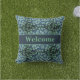 Acessorize seu espaço de vida ao ar livre com travesseiros decorativos confortáveis e confortáveis. Este travesseiro tratado termicamente apresenta um padrão de folha verde brilhante sobre um fundo azul escuro. Personalize este travesseiro decorativo ao ar livre com suas próprias palavras ou comprar, como mostrado com Welcome (Bem-vindo)