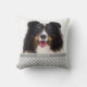 Modelo personalizável e simples de foto de animal de estimação em uma cor de fundo de uma cinza que tem um padrão de impressões de pata de cão branco. Há também uma área de texto personalizável para um nome ou outro texto personalizado sob a foto. O outro lado do travesseiro apresenta o padrão de impressão da pata branca em uma cor de fundo da cinza.