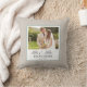 Este novo travesseiro decorativo apresenta um fundo de linha falsa com um quadro de fotos horizontal para sua foto favorita de casamento. O design oferece sotaques de teal empoeirado e texto elegante "Sr. e Sra." e texto personalizado para o nome do casal e sua data de casamento.
