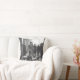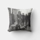 Kick back with this iconic throw pillow featuring a vintage black and white image of a dog walker with a group of french bulldogs in the city. The back side of the pillow is gray.