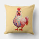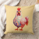 Um frango de cor vibrante se posiciona com uma expressão animada, mostrando detalhes complexos de penas em tons de laranja e vermelho. Os pontos azuis estilizados, decoram o peito frontal de uma galinha
