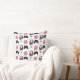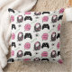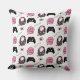 Travesseiro para jogos com gráficos cor-de-rosa, cinzas e pretos, como fones de ouvido, controladoras e nível de texto para cima.