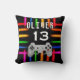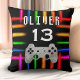 Travesseiro decorativo Neon Birthday do Controlador de Vídeo Gamer. Controladora de jogos em uma luz néon vívida e colorida sobre um fundo preto. Adicione seu nome e sua idade.