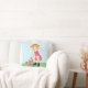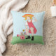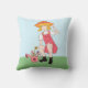 Bonita Gardening Girl e Travesseiro de cabelo louro com flores. Um desenho de uma garota com flores em uma lata de água.